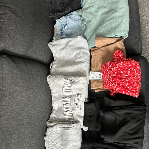Klespakke str S selges kr 200. Innholdet 5 bukser, 1 genser og 1 T-skjorte. Den ene olabukse er levis og nesten ikke brukt