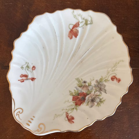 Kjennetegn: Tallerkenen har en karakteristisk bølget kant og en gullkant.