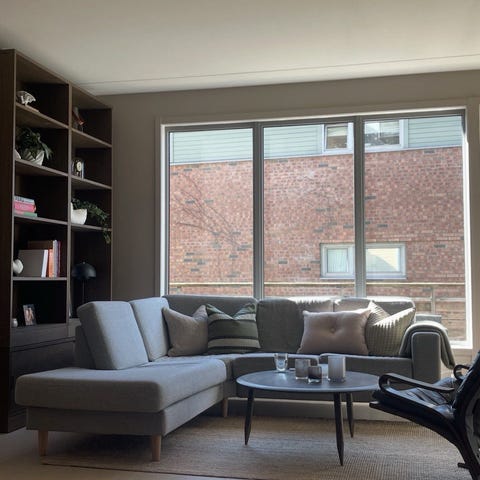 Sofaen er kjøpt hos Amøbler for noen år siden. Ett av hjørnene har litt slitne fjærer, men når putene er på plass synes det ikke. Vi har noen ganger lagt et pledd under puten for ekstra støtte, men den er fortsatt veldig god å sitte i uten. Sitteputene er tykke og myke.