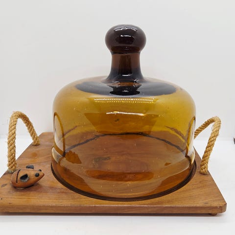 Jeg selger denne osteklokken i retro design. Klart glass og base i treverk. Det ser ut som teak men jeg vet ikke sikkert.