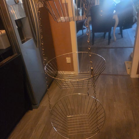 Fruktkurv i metall med tre nivåer for oppbevaring av frukt eller andre små gjenstander. Kurven har en rund form og er designet for å stå på benk eller bord. Passer til kjøkken eller spisestue. Denne selges for 200 utrolig flott å ha stående på kjøkkenet