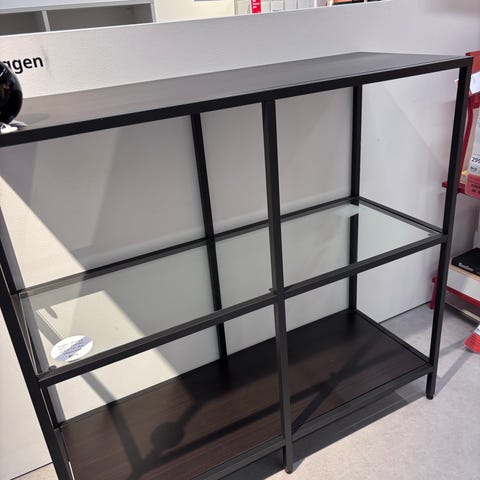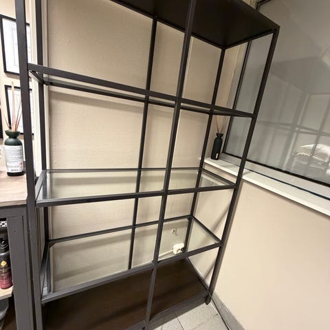 IKEA hyllesystem i brun/svart farge med glasshyller. Passer til oppbevaring og organisering av ulike gjenstander i hjemmet eller kontoret.
