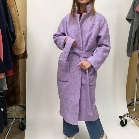 Omslagskåpe med belte i teksturert boucle-ull med overdimensjonerte, påsydde lommer. Bruk den åpen eller fremhev midjen med beltet.