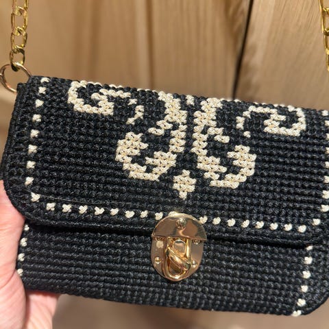 Håndstrikket veske for dame i svart og hvitt. Vesken har en kjedelignende skulderrem i metall og en dekorativ lås på fronten. Materialet er stoff, og designet har et mønster i kontrastfarger.😊