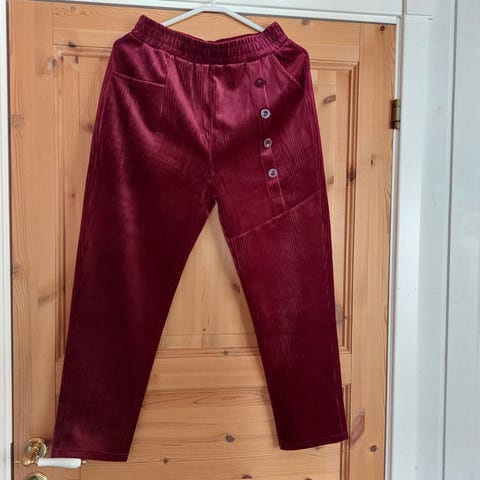 Cordfløyels bukser til dame selges. Naturhvite. Strikk bak i livet. Vide ben. Str S/M. Ikke brukt.