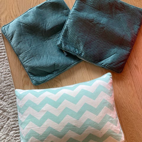Et knæsj rosa og et blått putetrekk i bomullsfløyel.