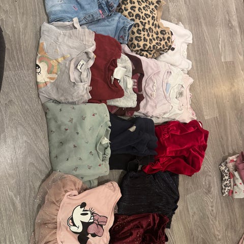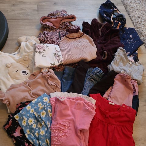 barneklær for jente i størrelse 92 med flerfarget design. Inneholder ulike plagg i forskjellige farger og materialer, egnet for barn i denne størrelsen.