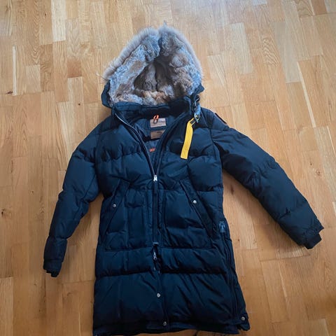 Varm og god mørk blå Parajumpers vinterjakke, slim fit, dame, str XS. Alt av glidelåser, lommer og annet fungerer som det skal. Lite rift i pelsen i hetta (se bilde). Nyvasket.