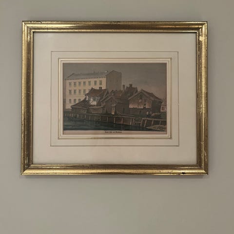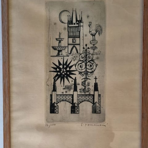 Signert tresnitt av Eli Hovdenakk. Nummerert trykk 24/28, i fargene svart og grønt. Format 21x30 cm
