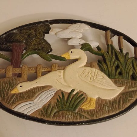 Gryteunderlag i vintage stil, med dekorativt gravert mønster. Ca 20 cm diameter. Passer for å beskytte bordet ved servering av varme gryter og kjeler.