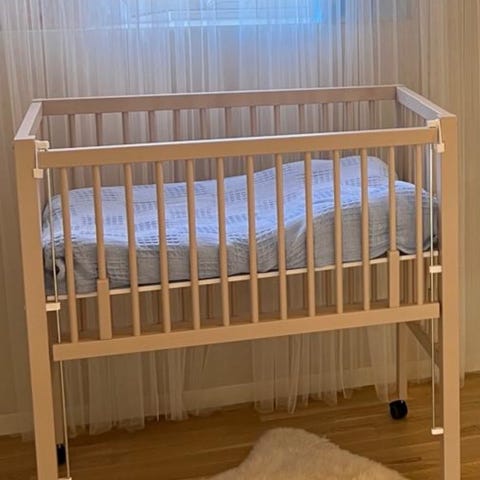 Selger vår nesten nye Yngri bedside crib barneseng i grå farge (kun brukt 2-3 ganger). Sengen er designet for å plasseres ved siden av foreldresengen for en enkel tilgang til barnet. Laget med materialer som gir ventilasjon og komfort. Madrass følger med. Selges pga plassmangel. 🌱