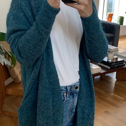 Acne Studios Raya cardigan i fargen blå/petroleum. Størrelse XXS, men stor si størrelsen så passer helt fint en S. Ingen skader etter bruk, i god stand.