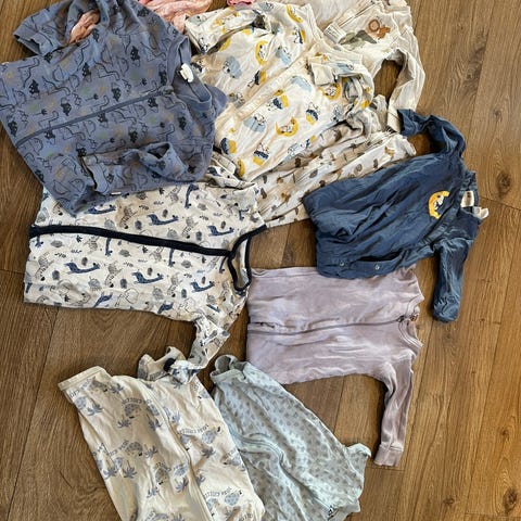 Stor klespakke for gutten i størrelse 50-62 med mange plagg inkludert bodyer, bukse/genser, pysjer
