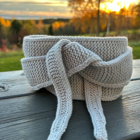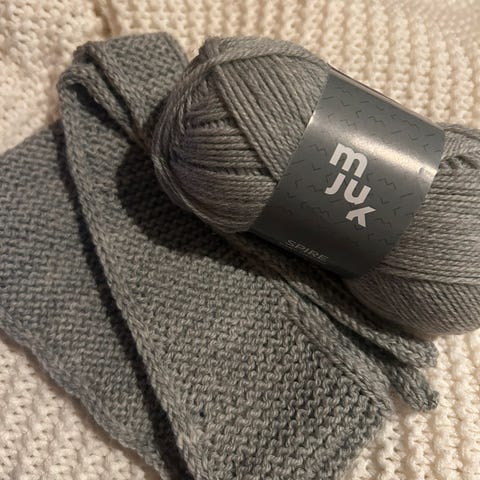 Hjemmestrikket Sophie Scarf det er strikket i Bystrikk tynn merinoull og tynn kidsilk erle: "Tynn Kidsilk Erle fra Dale Garn, 53 % kid mohair, 34 % silke og 13 % ull. 25 g = 287 m. Bystrikk Tynn Merino, 100 % extra fine merinoull. 50 g = ca 187 meter."