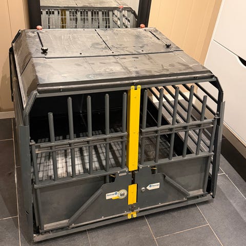 Mim Safe Variocage bilbur i metall. Designet for sikker transport av kjæledyr i bil, med solid konstruksjon og låsemekanisme. Flyttbar delevegg i bak kant slik at det ene rommet blir litt større. Buret er brukt til en stor og en litt mindre schæfer.