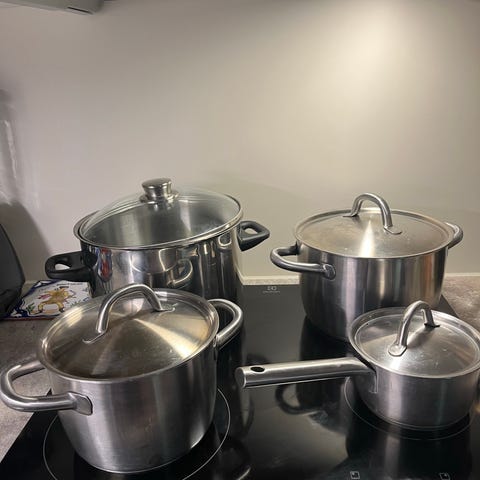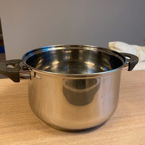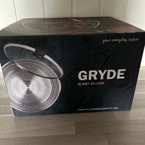 Stor stainless kjele med rist. Merket er Polaris, og kjelen er laget i Norge av stainless steel. Kan brukes til det meste, bl.a. damping av fisk på risten. Kan også brukes uten risten. NB: Passer ikke til induksjonsovn.