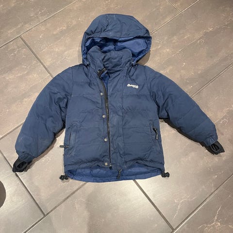 Bergans dunjakke og bukse for barn i størrelse 104. Jakken er grønn og laget av dunmateriale, designet for gutter. Buksen har forsterkede partier og refleksdetaljer for økt synlighet. Sele følger med.