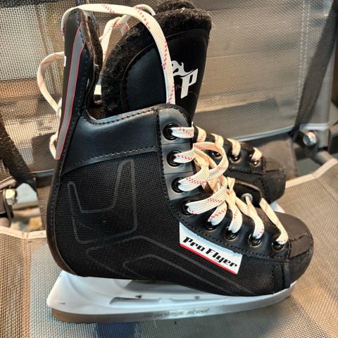Pro Flyer Ishockeyskøyter for barn i størrelse 35. Skøytene er designet for ishockey og har et svart ytre med hvite og røde detaljer på lisser. Egnet for bruk på is til ishockeyaktivitet eller lek på isen