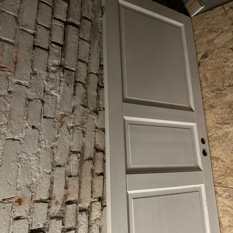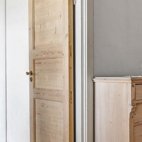 Treinngangsdør i tremateriale med synlige bruksmerker. Døren har en sylinderlås og en dørkarm i tre. Passer til innvendig eller utvendig bruk, avhengig av installasjon. Ingen ytterligere merke- eller modellinformasjon tilgjengelig.