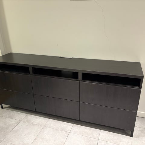 Pent brukt bestå tv-benk fra IKEA, sort. Har et lite fukt-merke på midten på toppen, der ledninger kan få plass, vist på bilde. Det var ikke synlig for oss før vi skulle flytte den ned for salg, så vil ikke si at det synes godt. Kjøpt ny for tre år siden.