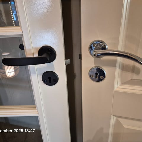 8 Dørvrider i krom med tilhørende nøkkelskilt. Produktet består av to dørvridere og to nøkkelskilt, egnet for montering på dører med nøkkellås. Pris 200 pr stk eller 1200 for alle