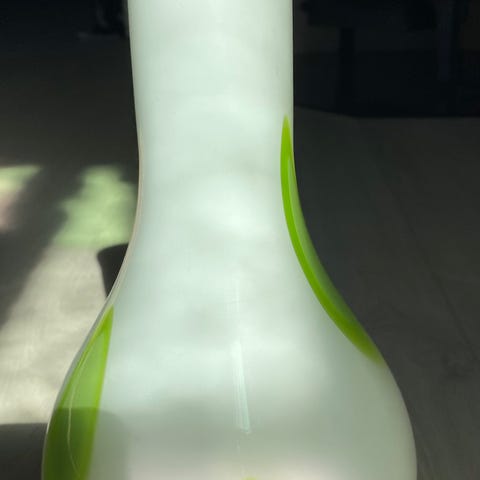 Flott hvit glassvase med mørk grå mønster.🌸 Ingen skader eller slitasje. Høyde: 21 cm.