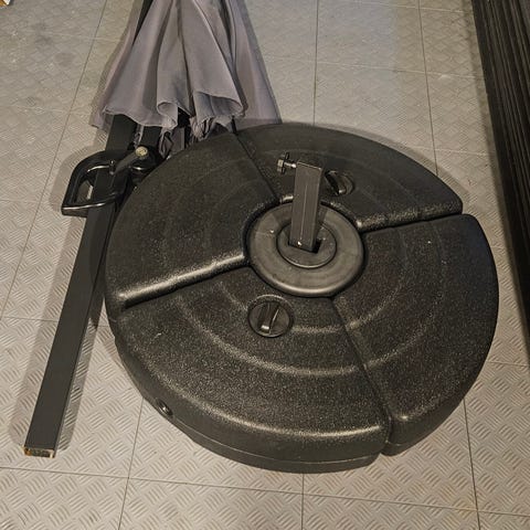Selger en pent brukt parasoll og parasollfot kjøpt i 2024. Trekk til parasollen medfølger. Parasollen er kjøpt på plantasjen og er i offwhite med stamme i imitert lyst tre. Parasollen kan tiltes. Parasollen har et bruksmerke på stammen der den festes i foten. Parasollfoten er i granitt med hjul med en vekt på 30-40 kg.