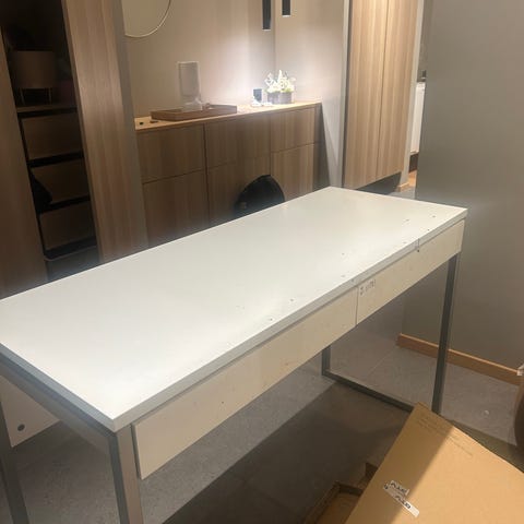 Fullt brukbart og stødig skrivebord med bruksmerker. Skrivebordet er hvitmalt og kan pusses og males for å få det helt fint. Skrivebordet har en tastaturskuff til å dra ut foran. Det kan hentes i Grusveien 5, 1435 Ås. Bena kan demonteres for transport.
