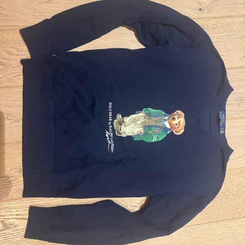 Ralph Lauren Polo Bear genser i størrelse S. Genseren er hvit og laget av bomull. Den har et Polo Bear motivet på forsiden er noe slitt, et par flekker (se bilder) Genseren er godt brukt men fortsatt fin..