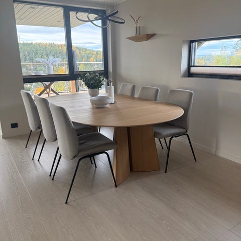 I tillegg 2x ileggsplater som utvider med plass til ytterligere 2 personer per ileggsplate, totalt da komfortabelt plass til 12 personer.