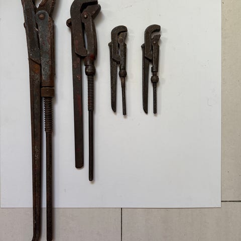 Kongsberg Boltesaks/Kjettingtang, 18" smidd stål, Bacho fastnøkkel 34, Kongsberg skiftnøkkel, nr 84, Bahco skiftnøkkel. Jeg har dessverre ikke mulighet for å sende.