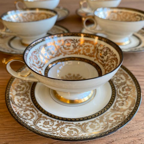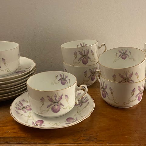 Rosenthal Pompadour kaffeeservise i porselen med dekorative blomsterdetaljer. Settet inkluderer kaffekanne, sukkerbolle, to kopper og to skåler..