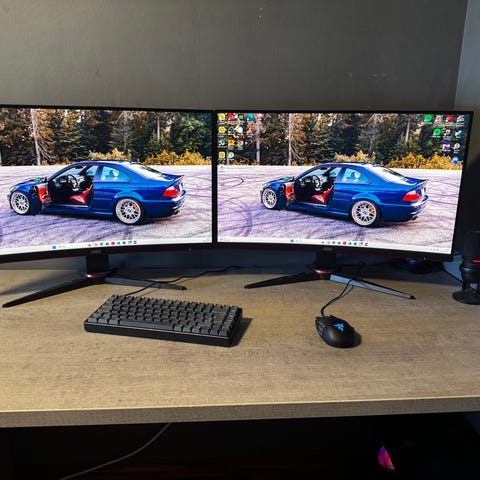 2x AOC Z27G24 27" skjerm med oppløsning på 1920x1080 piksler og oppdateringsfrekvens på 144 Hz. Skjermen har støtte for NVIDIA GeForce RTX 3060 via DisplayPort, standard dynamisk fargerom (SDR) og variabel oppdateringsfrekvens mellom 49 og 144 Hz. Sort farge.