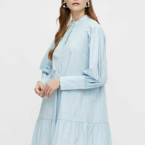 YAS Hverdagskjole i blå farge, laget av bomull. Kjolen er i størrelse L og er designet for kvinner. Den har et mønster med striper og et belte i livet.