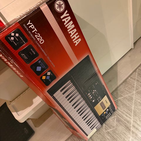 Yamaha YPT-210 keyboard med 61 tangenter, inkludert stativ og rød bæreveske. Elektronisk keyboard med 375 forskjellige lyder. Har et lite knekk på baksiden som man ser på bildet men funker helt fint.