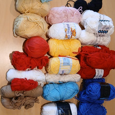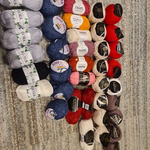 Stor garnpakke med flere farger og garntyper. Garnet består av ulike farger som beige, blå, rød, svart, hvit, grønn og flere nyanser. Passer til ulike strikke- og hekleprosjekter. Mye restegarn og noen fulle nøster