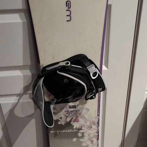 På ett punkt på snowboardets kant er det en bulk fra en stein – se alle bildene.
