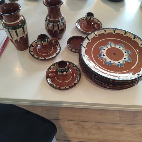 Kjelen ær av rustfritt stål , håndtaket av svart plast og den plystrende tuten er av messing.