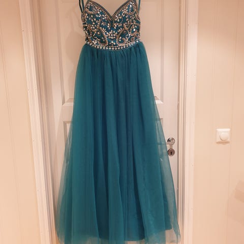 Ballkjole m paljetter. Kongeblå. Fra kjolebutikk Mybella i Oslo.. Brukt en gang på skoleball. Selges u halv pris. Passer godt til jente ca 1.70 Fasong er lett å tilpasse med snøring i ryggen. Selges rimelig pga rift. Rift er sydd.. Se bilde. Str Small.
