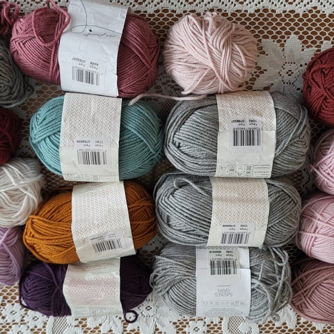 Masse flott restegarn. To av nøstene er fulle, og flere er nesten fulle. Alle nøstene er i ull.