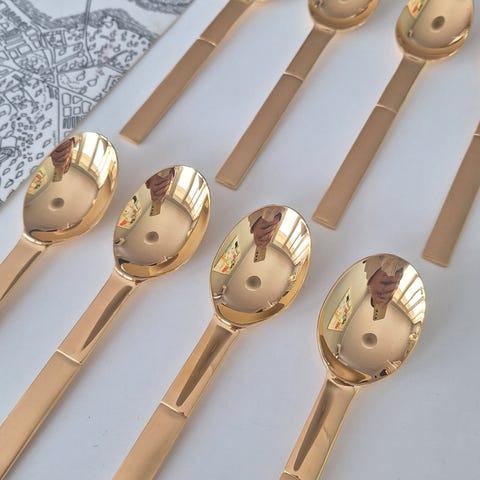 8 NOBEL vintage forgyllte kaffeskjeer / teskeer fra svenske Gense, designet av Gunnar Cyrén. Utgått serie, aldrig brukt, har bare lagt i skuffen. Lengde ca 12,5 cm. Stemplet bak. Vakker svensk design. Kjøpt I sin tid hos Nordic Nest.