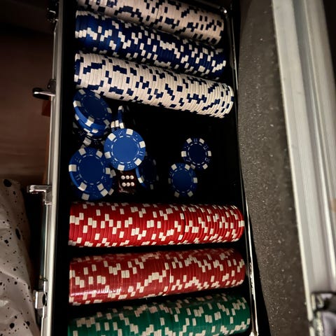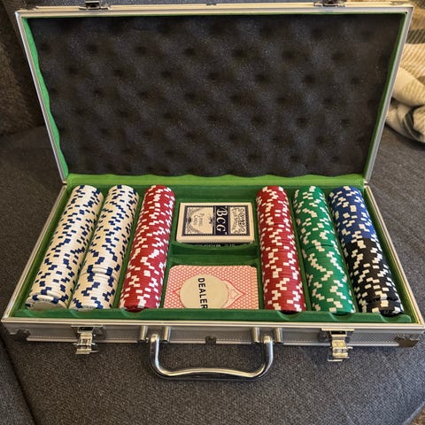 Pokersett i aluminiumskoffert med fargede pokerchips (verdi 1, 5, 25, 50 og 100), terninger og dealer-brikke. Merk at settet mangler de to kortstokkene som opprinnelig fulgte med.