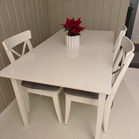 IKEA spisebord med to innleggs plater, går fra 175 cm til 260cm Stoler kan også føle med viss ønskelig. 8 stk