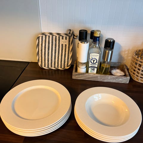 IKEA servise i svart, bestående av 18 deler inkludert tallerkener, boller og kopper. Serviset er laget i slitesterkt materiale og egnet for daglig bruk. Tallerknene og de dype tallerknene er pent brukt. Skålene og koppene er ubrukt.