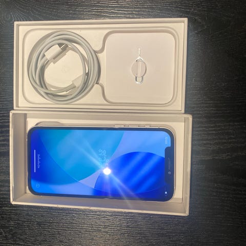 Apple iPhone 12 mobiltelefon med 128 GB lagringskapasitet i blå farge. Enheten har en skjermbeskytter tilpasset iPhone 12/12 Pro og lader inkludert. Telefonen viser noe slitasje på sidene, som vist på bildene. I tillegg har den vært under vann 1 gang, men fungerer som den skal! 86% batterikapasitet. Mobilen er nullstilt og klar for ny eier 😊