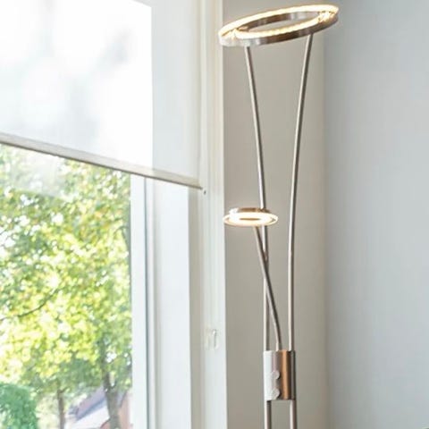 Meget funksjonell uplighter med lesearm. Lampen består av en øvre lampe og en leselampe, som oppfyller to lysfunksjoner samtidig. Begge lampene kan dimmes separat. Lesearmen er meget godt justerbar ved hjelp av to fleksible deler. Lyspærer inkludert. Må hentes.