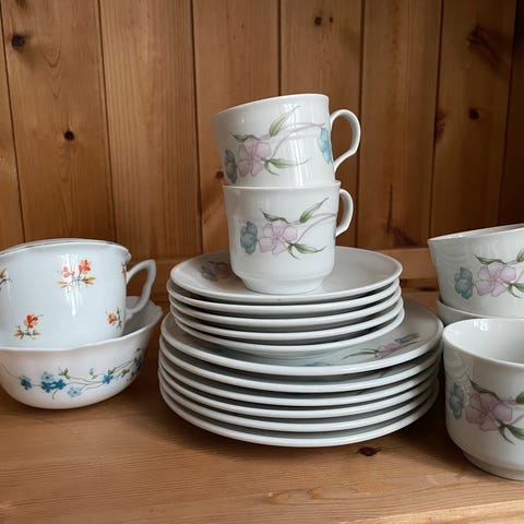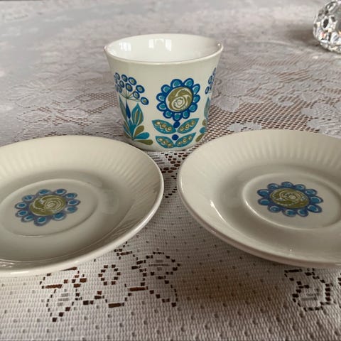 Arabia servise med jordbærmotiv. Inneholder kopp, bolle og tallerken med fargerikt jordbærdesign. Egnet for daglig bruk i kjøkkenet.Det står ikke noe merke under. Men kom opp her at det er Arabia.Det er aldri brukt. Kan sendes mot frakttillegg. Har vipps.