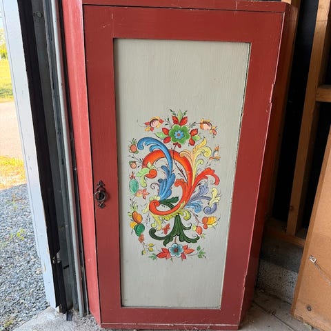 Gammelt hjørneskap i tre, malt rødt, med glassdør øverst, en skuff i midten og skapdør nederst. Skapet har dekorative detaljer rundt glassdøren og er designet for oppbevaring i hjørner.
