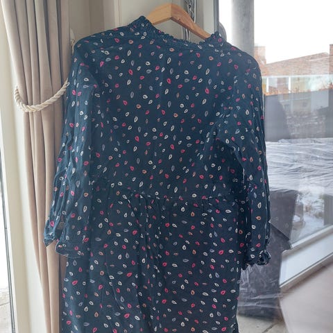 Nydelige farger og mønster. Pene ermer og liten splitt i sidene. Kan også brukes med belte.