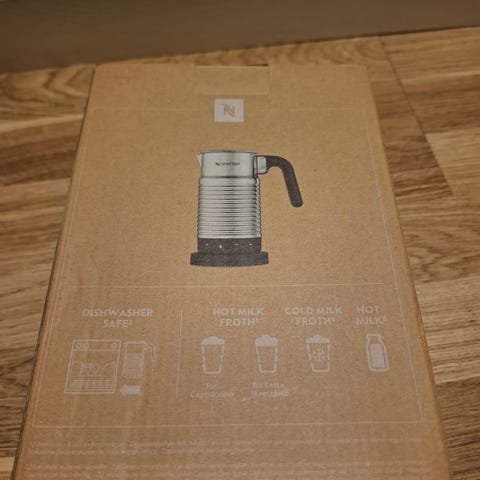 Nespresso Aeroccino 3 melkeskummer i rustfritt stål med svart håndtak. En elektrisk melkeskummer designet for å lage skummet melk til kaffedrikker.